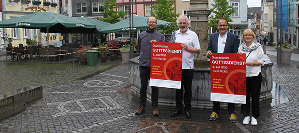 Die Idee kam vom Werbering Hachenburg. „Da der verkaufsoffene Sonntag wegen Corona ausfallen muss, haben wir vorgeschlagen einen Ökumenischen Freiluft-Gottesdienst auf dem Marktplatz zu organisieren,“ sagt Werbering-Vorsitzender Volker Schürg. „Die Menschen möchten einfach wieder zusammenkommen und sich treffen, auch ohne die Gelegenheit zum Einkaufen.“ Stattfinden soll der Gottesdienst am Sonntag, den 5. Juli um 10 Uhr. Ein toller Einfall, den die Evangelische und die Katholische Kirchengemeinde Hachenburg sofort unterstützten. „Das gibt uns eine schöne Gelegenheit zu einem ersten gemeinsamen Auftakt-Gottesdienst seit Beginn der Coronakrise für und in der Region für die Kirchengemeinden Hachenburg, Altstadt, Kroppach und Alpenrod“, sagt der Evangelische Pfarrer und stellvertretende Dekan Benjamin Schiwietz. „Zusammen mit der katholischen Gemeinde und Open Air auf dem Marktplatz zu feiern, ist zusätzlich reizvoll.“ Sein katholischer Kollege Winfried Roth freut sich ebenfalls über die tolle Gelegenheit. “Kirche muss aus sich heraus und mehr unter die Menschen gehen, sagt er.“ Beide Pfarrer werden den Gottesdienst unter dem Bibelwort aus Galater 6, Vers 2 „Einer trage des anderen Last, …“ gestalten. Musikalisch unterstützt werden sie durch Mitglieder des Musikvereins Blau Weiß Limbach und des MGV Eintracht Rosenheim.