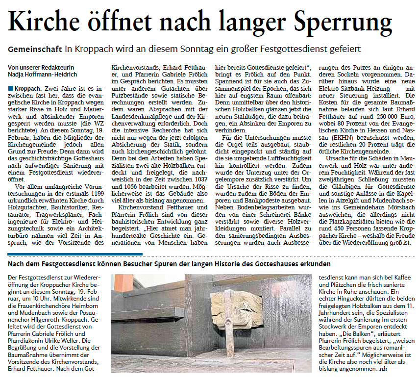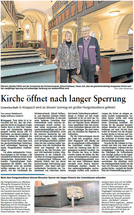 Kirche öffnet nach langer SperrungAllgemein / 22. März 2017 22. März 2017 Für eine vergößerte Ansicht des Textes bitte auf den Artikel klicken. Veröffentlichung mit freundlicher Genehmigung der Rhein-Zeitung. Erschienen in der Westerwälder Zeitung vom 18. Februar 2017
