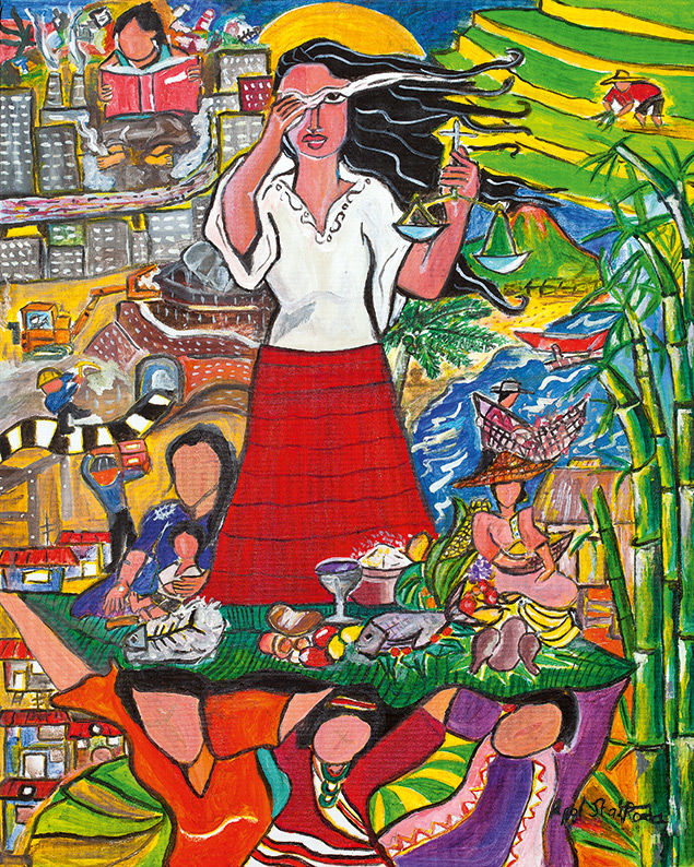 Wenn wir diesen bisher ungehörten Geschichten von den Philippinen und von Nebenan Raum geben, dann wird unsere Welt ein bisschen bunter, so wie im diesjährigen Titelbild von Rowena Apol Laxamana-Sta.Rosa. Wir werden uns zugleich die Frage stellen, die unsere philippinischen Schwestern uns zumuten: „Was ist denn fair?“ Die Verfasserinnen setzen die Geschichten von Merlyn, Celia und Editha in Kontrast zum biblischen Gleichnis der Arbeiter im Weinberg (Mt 20, 1-16). Als Gegenmodell zur profit-orientierten Konsumgesellschaft sehen sie auch die indigene Tradition des Dagyaw oder Bayanihan: Alle arbeiten gemeinsam und teilen die Ernte.